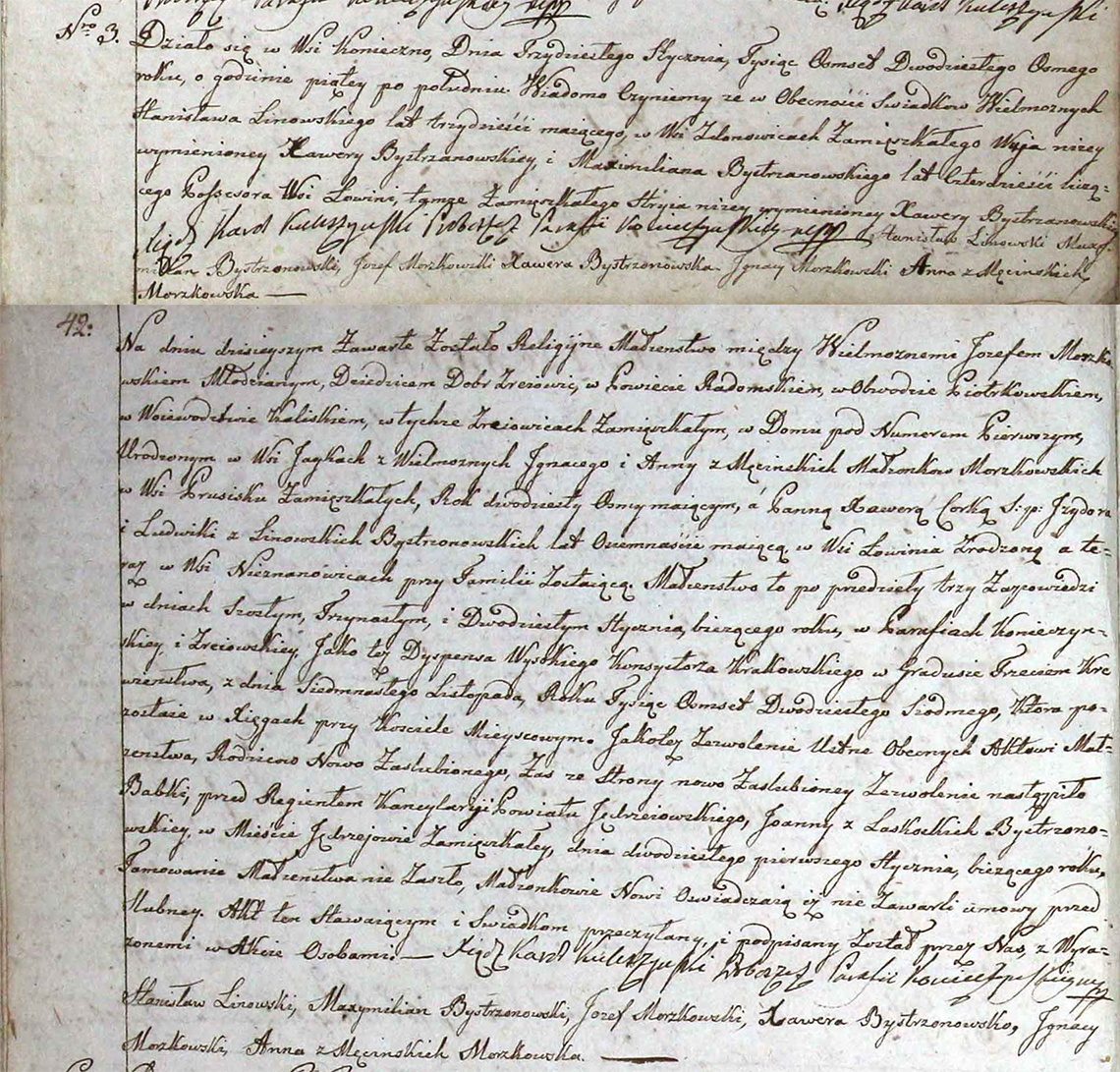 Akt stanu cywilnego małżeństwa Józef Morzkowski & Xawera Bystrzanowska 30.01.1828 r.