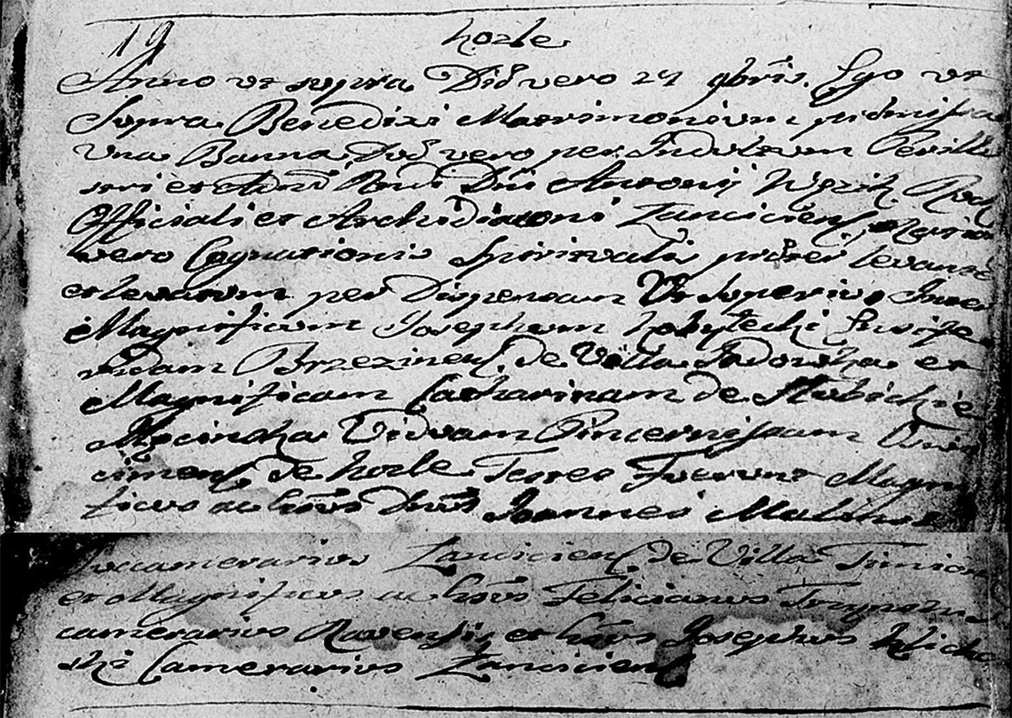 „[1760]. Roku Pańskiego 1760, dnia 21 listopada, w ostatnią niedzielę [po Zielonych Świątkach], za moim obecnym upoważnieniem i zgodą, poprzedziwszy trzema zapowiedziami w dni świąteczne, nie wykrywszy żadnych przeszkód kanonicznych, czcigodny wielebny ojciec Tomasz Kotlarski, gwardian klasztoru łagiewnickiego, pobłogosławił i zatwierdził wobec kościoła parafialnego małżeństwo zawarte zgodnie z prawem pomiędzy Urodzonym Wielmożnym Pawłem Sokołowskim (zaślubionym po raz drugi), chorążym zakroczymskim, a Urodzoną Wielmożną Anną Męcińską panną ze Słubicek [?], cześnikówną oświęcimską, [a] wielmożny Sokołowski z dóbr Olszewy dziedzicznych w Kujawach Małych. Obecni byli: Wielmożny Pan Adam Lasocki, Podcza[szy] Sochaczewski z dóbr Kujawy, nadto tutaj z dóbr Gosławic, i obecni byli: Urodzony Wielmożny Franciszek Wilkanowski, sędzia Województwa Łęczyckiego i Wielmożny Kajetan Męciński, brat z dóbr Biała, Wyski, itd., Wielmożny Pan Jan Sztembart, Cześnik Parnawski z dóbr natenczas Osse, Wielmożny Pan N. Szypowski, Wielmożny Pan Józef Trzciński, Kasztelan Rawski, rycerz, Wielmożny Pan Sokołowski, rycerz, oraz wielu innych i wielmożnych panów itd., zarówno z Kujaw jak i z województwa łęczyckiego, wiarygodnych, wspólnie żyjących we dworze […].”. |