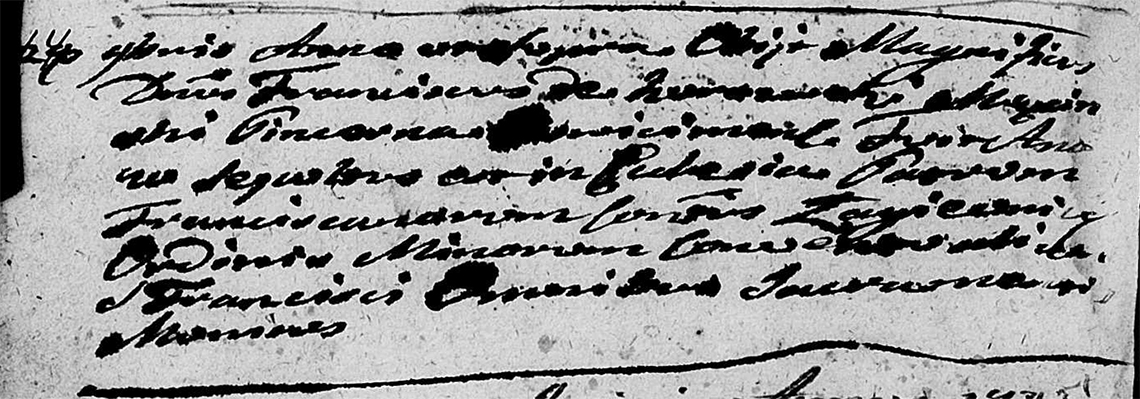 „[1776]. [Grudzień]. Żarki Dwór. Dnia 30 Listopada, ja Brat Feliks Sekuliński, ochrzciłem z wody dziecię o imionach Andrzej Mikołaj i Xawery, syna Jaśnie Wielmożnych Państwa Adama i Anieli Męcińskich. Chrzestnymi byli Wojciech Jankowski i Agata Berezińska, ubodzy ze szpitala.”. |