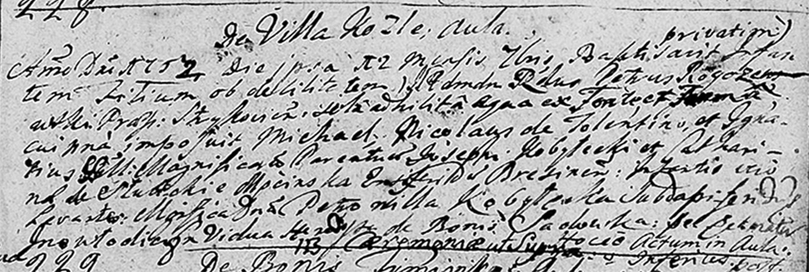 „Ze wsi Koźle, dwór. Roku Pańskiego 1752, dnia 12 miesiąca września ochrzcił prywatnie z powodu słabości dziecka Przewielebny Piotr Rogożewski Proboszcz Strykowski z samej wody imionami Michał Mikołaj z Tolentino, i Ignacy Wielmożnie Urodzonych Józefa Kobyłeckiego i Katarzyny ze Słubickich Męcińskiej, Miecznikowiczów Brzezińskich. Rodzice chrzestni: Wielmożna Pani Petronela Kobyłecka Podstolicowa Inowłodzka, wdowa, dziedziczka z Dóbr Sadówka: . . . [?].