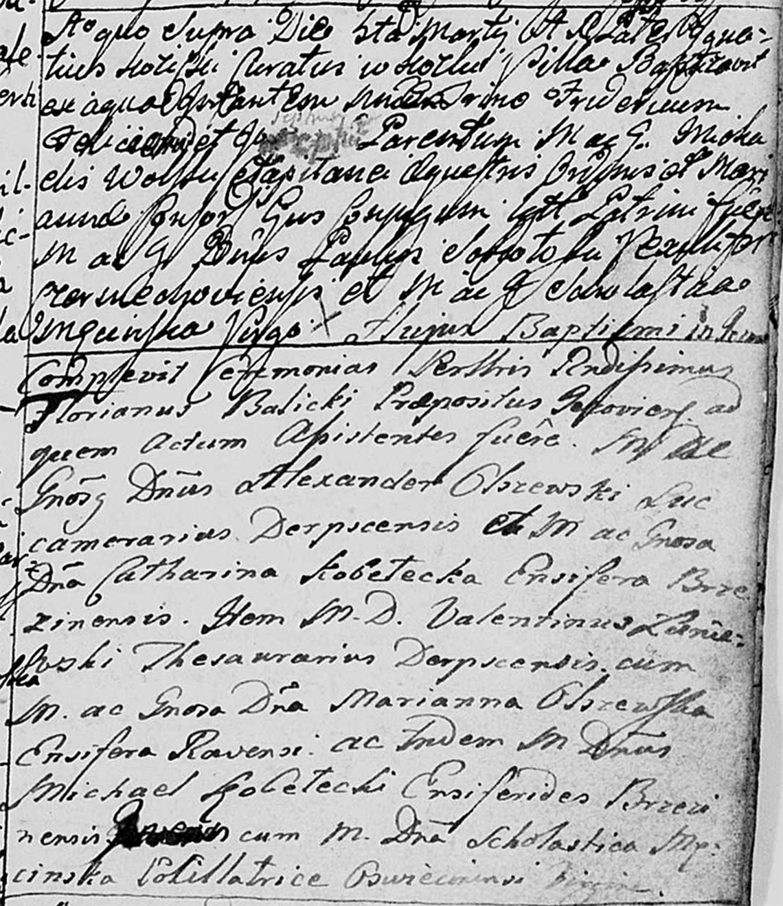„[1763]. Dwór Parafialny Koźle. Roku pańskiego 1763 dnia 16 Marca wobec zagrożenia życia Ja Tomasz Pilaszkowski, na teraz Komendarz Kozielski, ochrzciłem prywatnie z wody imionami Jozafata Gertruda córkę Wielmożnych Państwa Pawła Sokołowskiego, Chorążego Gostyńskiego, i Wielmożnej Anny z domu Męcińska, ślubnych małżonków. Rodzicami chrzestnymi byli Szlachetny Szymon Niwinski, Ekonom, i Wielmożna Panna Marianna Męcińska, Cześnikówna Oświęcimska. Natomiast 20 tegoż Miesiąca dopełniłem ceremonii chrztu nad dzieckiem Jozafata Gertruda i Katarzyna. Asystowali wraz z rodzicami chrzestnymi Wielmożnie Urodzeni, Wielmożny Pan Józef Ignacy Wilczycki z Dóbr Psary z Wielmożną Marianną Męcińską, panną; Wielmożny Pan N. Zielenski, krewny z Wilczyckich z Prus z Wielmożną Panią Katarzyną Męcińską, Miecznikówną Brzeską; Wielmożni Wielmożny Jan … z Dóbr Osse.”. |