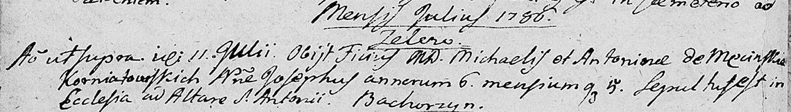 „Miesiąc Lipiec 1786. Zelów. Roku jak powyżej, dnia 11 Lipca zmarł syn Wielmożnych Państwa Michała i Antoniny z Męcińskich Kurnatowskich imieniem Józef w wieku lat 6, miesięcy 5. Pochowany w Kościele przy Ołtarzu św. Antoniego.”. |